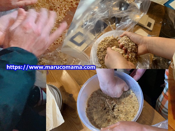 写真7 ⇒玄米糀と塩を混ぜます!これを塩切というんだそうです。(ここ重要⇒)家族3人で交代して塩切しました。塩切した玄米糀はいったんビニル袋から取り出します。